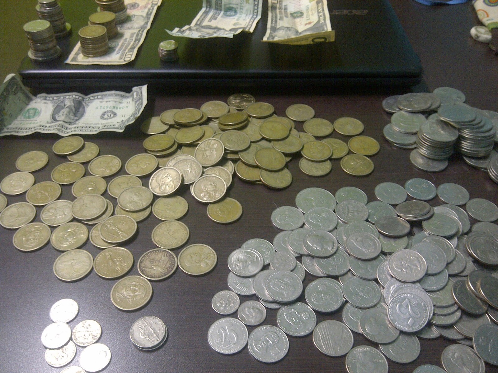 Meanwhile, this (counting change) has been my life for the last 20 days of school. We're looking for a way for the school to have a petty cash flow, so the Moms' Club is selling relatively healthy snacks at recess every day. Seems simple, trivial even; however, I have become in charge of this endeavor and have even lost sleep worrying about the endless logistics. Sometimes we have days were we earn $4... some days $7 or even $12. Today we broke even. The kids bought candy through the fence from vendors instead of our fruit salad. Go figure. All that aside, I do enjoy my hour and a half with the women from Moms' Club as we talk and plan and sell and clean up every day.